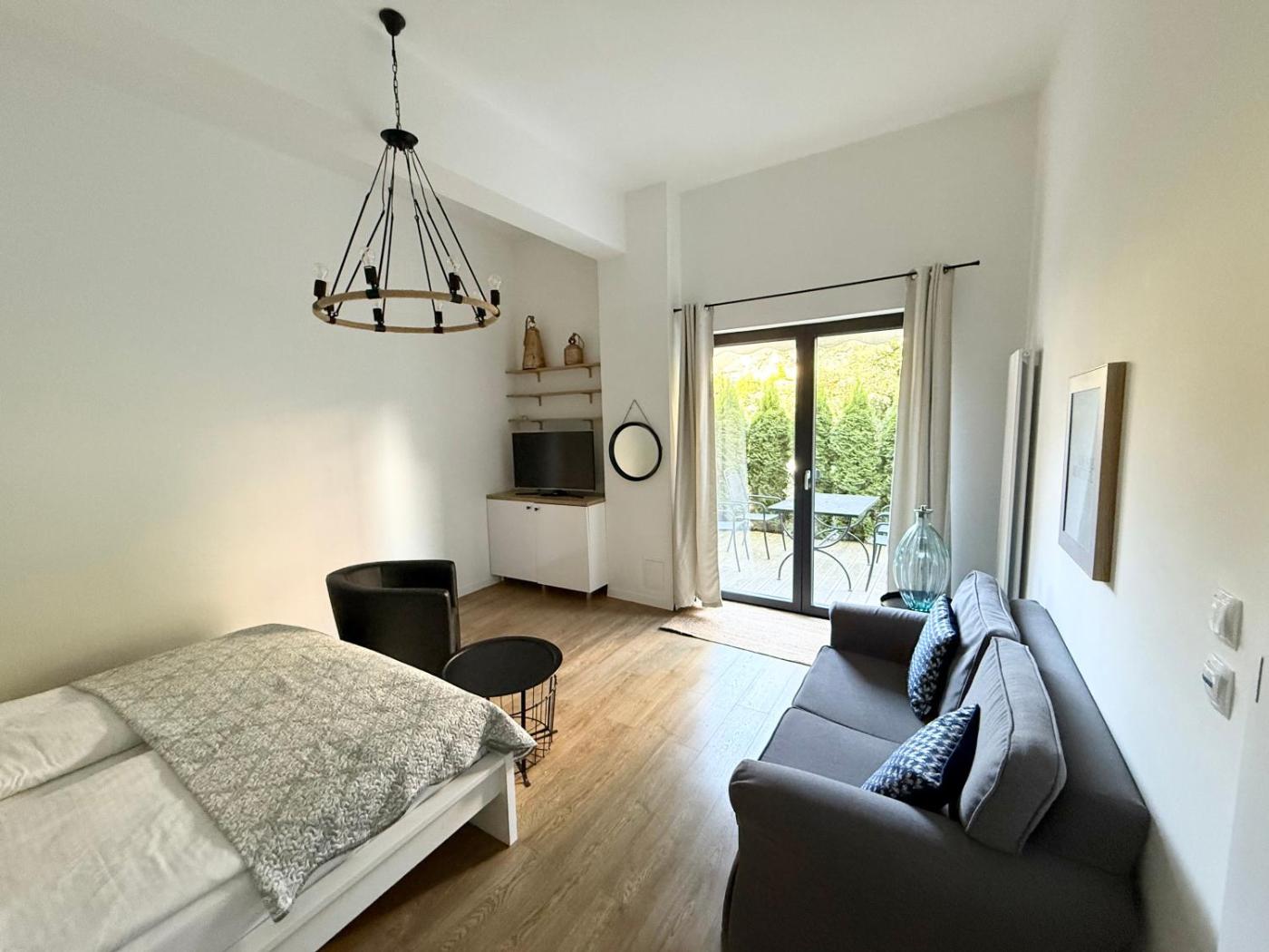 Apartament typu Junior Suite z tarasem. Apartament typu Junior Suite z tarasem balkonem" An apartment with a bedroom and a living room, located on the ground floor or in the second floor. It has a terrace or a great balcony and a spacious bathroom. The room features a kitchenette without a cooking option. The kitchenette comes with a kettle, tableware, fridge. Rodzinny - 3 osobowy. Powierzchnia pokoju ok.: 30 mkw. ;